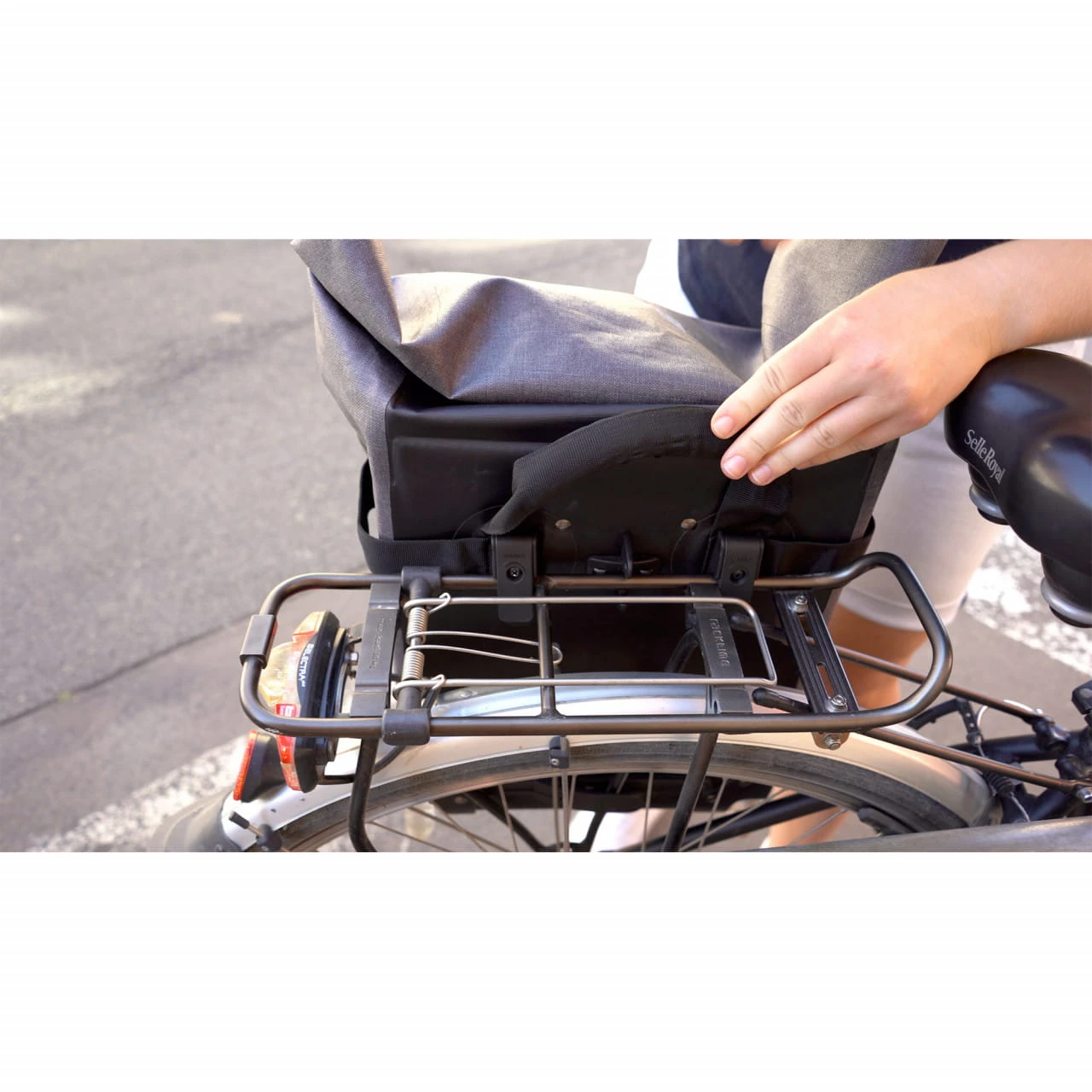 Die Fahrradtasche ist dreifach gesichert, damit sie auch auf holprigen Wegen immer zuverlässig am Gepäckträger hält.