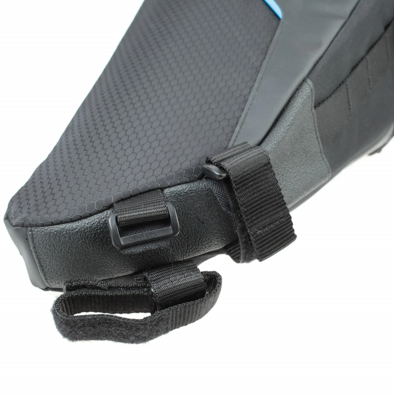 Die einzelne Schnalle löst die Tragetasche und befestigt das Gurtzeug sicher an deinem Mountainbike oder Rennrad. Der Gurt ist PE-verstärkt und sorgt somit für zusätzliche Stabilität. Der Taschenboden aus langlebigem, leicht zu reinigendem Material, ist wasserdicht und dient an nassen Tagen als Kotflügel.