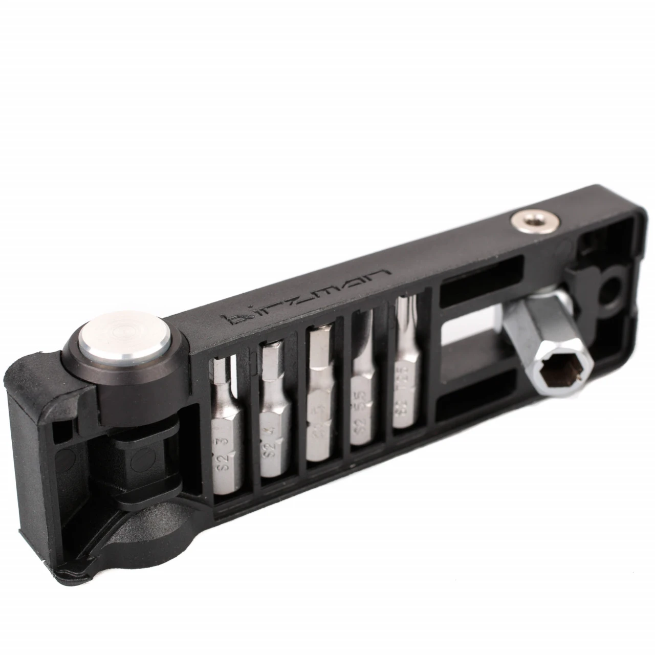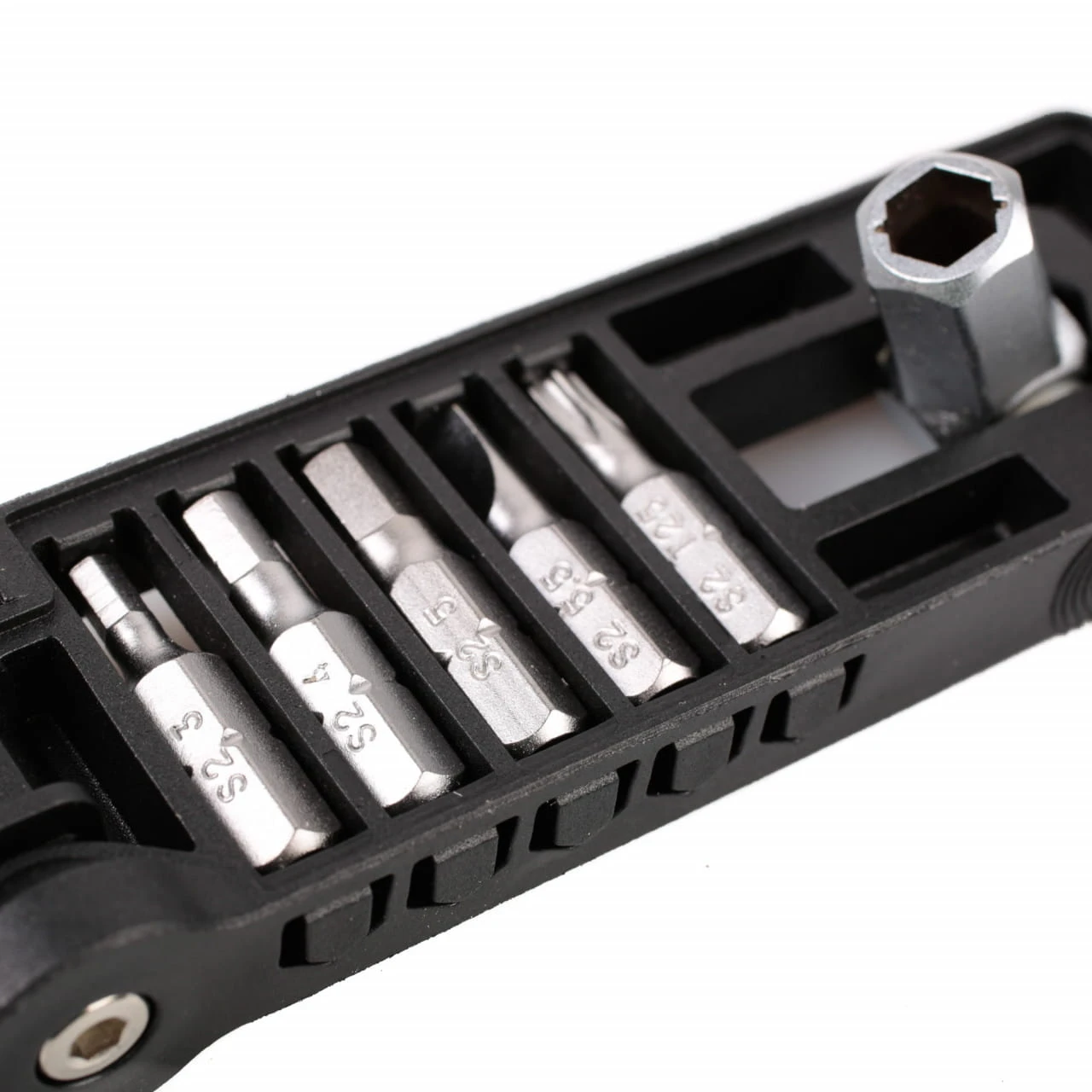 Mitgeliefert werden fünf Bits in den gebräuchlichsten Größen und im Gehäuse verbirgt sich ein Reifenheber mit Speichenhaken und Ventilöffner.