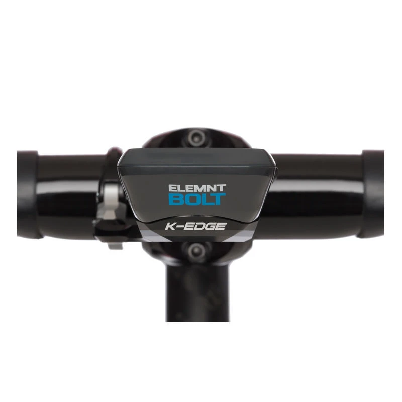 Der K-Edge Aero Race Mount ermöglicht eine mittige Einstellung in Verlängerung des Vorbaus. Das Gehäuse des Elemnt Bolt integriert sich förmlich in den Halter.